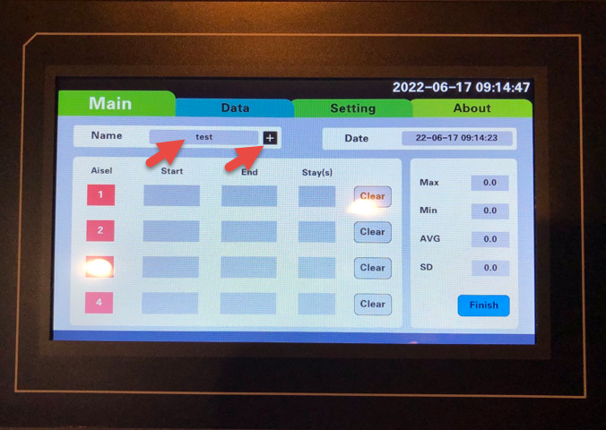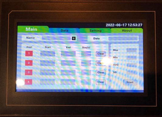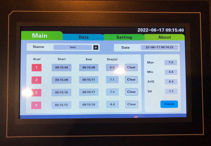 Click Start button, the system will be in the test mode and the button shows Finish. Once the animal is put on a lane of the bar (say #1), the Start field will record the start time, and the Stay(s) will be updating per second. When the animal is off the bar, the End field will record the end time and Stay(s) stop updating.