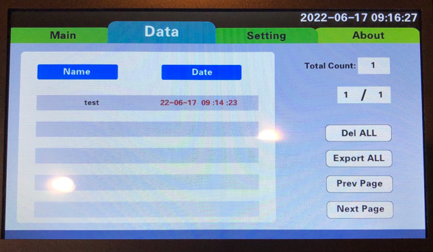 The user can delete the dataset or export the dataset. To export the dataset, the user click the Export button. Make sure the USB drive is inserted before Export operation is performed.