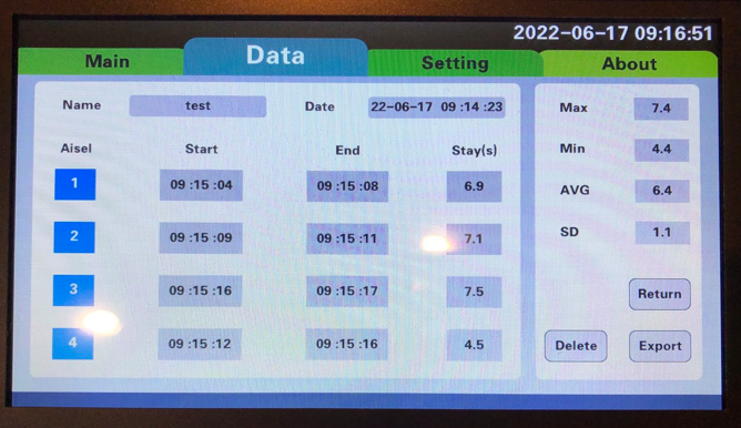 When this trial is complete, click Finish button and the data is saved. A hundred datasets can be saved. However, we suggest users to export datasets frequently.