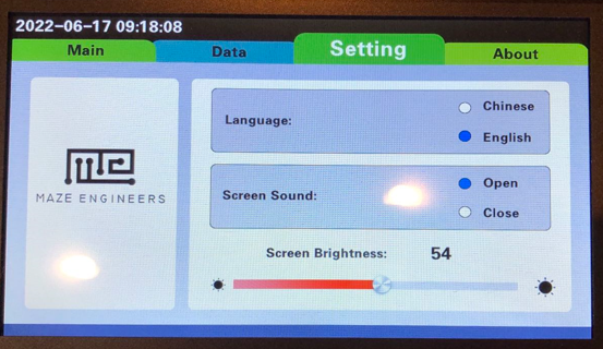 The setting allows user to set language preference, screen sound and brightness.