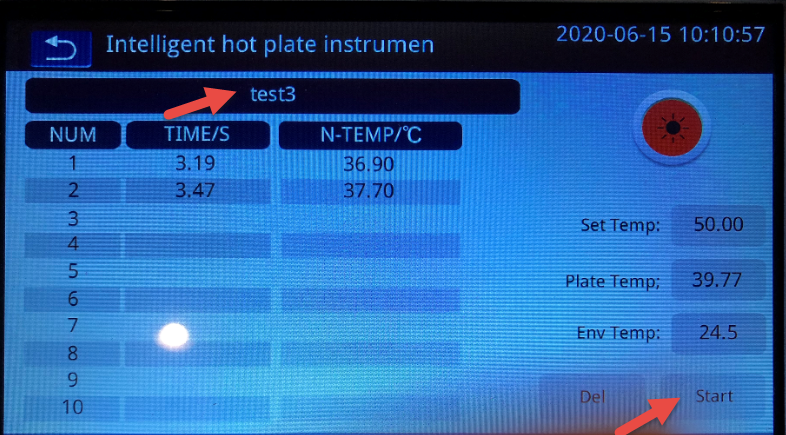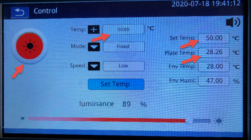 After a temperature, say 50, is entered, and Set Temp button is pressed, the Set Temp field displays the target temperature and the current state becomes Heating. Plate Temp displays the current temperature of the hot plate.