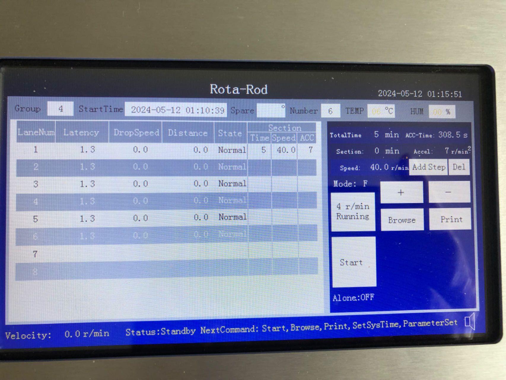 Click on Start on the screen, the Rotarod will start the experiment. The current speed is shown on the bottom line.