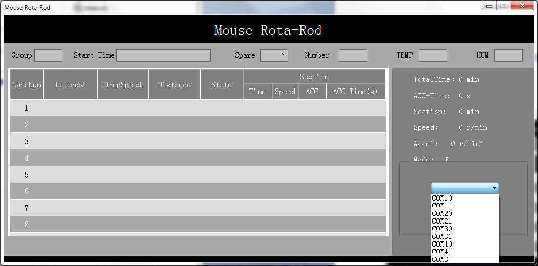 Once your computer recognizes RotaRod hardware, it is ready to establish the connection. Click on COM1, a list of available COM ports will be shown as below. Choose the correct COM port and then click on Port Open.